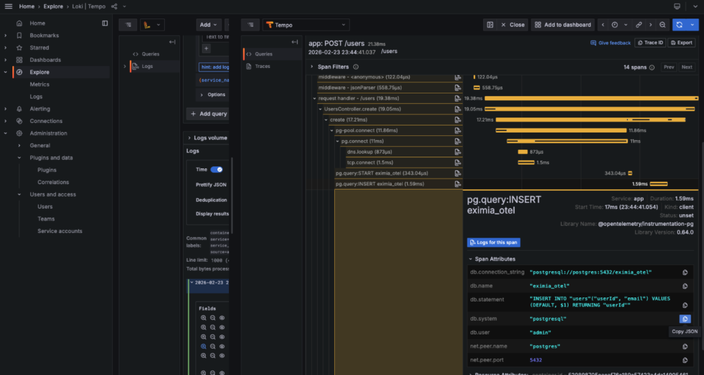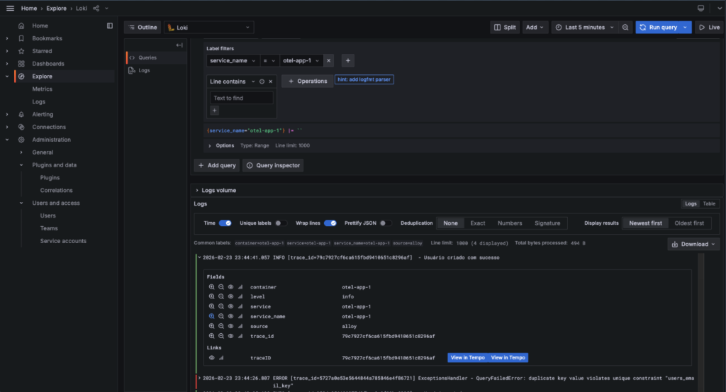 Ao abrir um log no Grafana, aparece um link “View in Tempo” que leva direto para o trace completo daquela requisição, sem precisar copiar o ID manualmente.