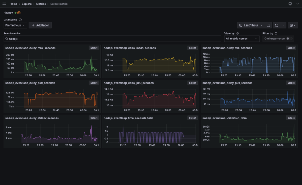 Para explorar as métricas, acesse Metrics no Grafana. No card Select metric aparecem os gráficos gerados automaticamente. Separei algumas métricas úteis para acompanhar o comportamento de APIs e do runtime Node: