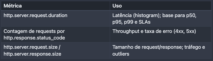- Base suficiente para começar a medir latência, gargalos e taxa de erro por endpoint