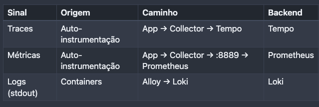 Essa separação significa que, quando você quiser trocar o provedor, de Grafana Cloud para Datadog, por exemplo, basta mudar a configuração do Collector. A aplicação não precisa saber para onde os dados vão. A tabela acima resume o fluxo por tipo de sinal.